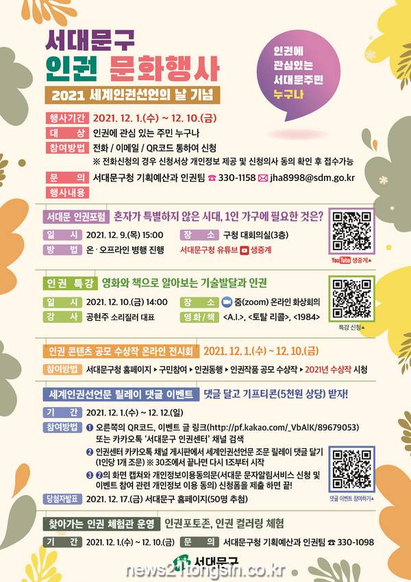 서대문구가 세계인권선언(1948. 12. 10.) 73주년을 기념해 대면과 비대면으로 포럼, 특강, 전시, 릴레이 댓글 이벤트 등 다양한 인권문화행사를 개최한다.