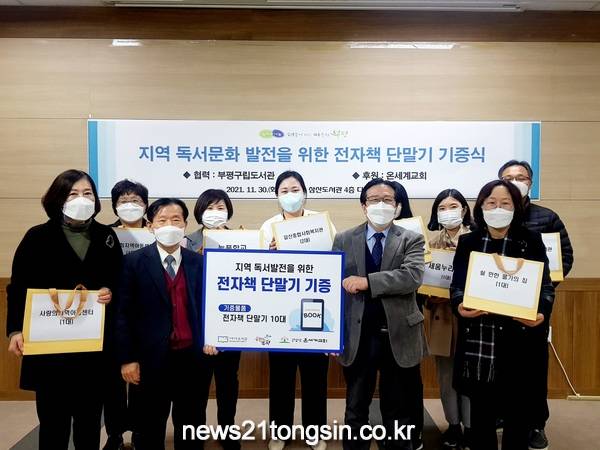 부평구 부평구립도서관은 지난 11월30일 지역의 독서문화 발전을 위해 ‘책 읽는 부평’ 사업 추진협의회에 참여하는 온세계교회로부터 전자책 단말기 10대를 기증받았다.
