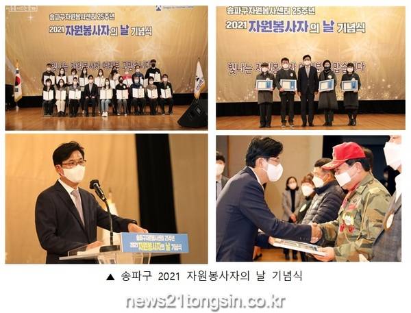 ▲ 사진=송파구송파구(구청장 박성수)가 운영하는 자원봉사센터는 ‘자원봉사센터 설립 25주년’과 ‘자원봉사자의 날(12월 5일)’을 맞이해 지난 11월 30일 송파구민회관 대강당에서 「2021 자원봉사자의 날 기념식」행사를 개최했다고 밝혔다.