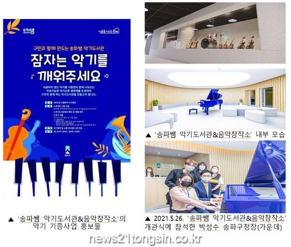 지난 5월 송파구청 사거리 지하보도 공간을 리모델링해 개관한 ‘송파쌤 악기도서관&음악창작소’는 주민 누구나 예술‧문화적 갈증을 해소할 수 있도록 악기를 공유하고 음악적 체험과 교육을 제공하는 공간이다. 스튜디오, 음악창작실, 악기수장고, 소공연홀 등의 시설과 건반악기‧현악기‧관악기‧레코딩 및 미디 장비 등 500여 개의 악기를 보유하고 있다.