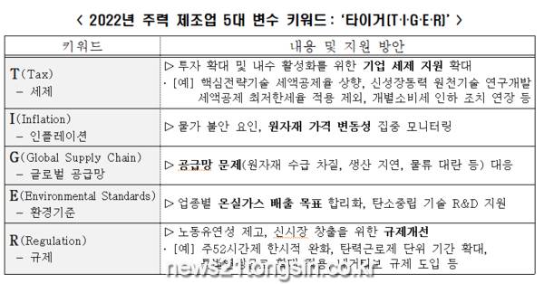 한편 전경련은 수출 주력 업종 협회들이 밝힌 애로사항과 희망 정책을 기반으로, 2022년 국내 주력 제조업의 5대 변수를 ‘타이거(T·I·G·E·R)’라고 제시했다. 전경련 관계자는 ▲세제(Tax) ▲인플레이션(Inflation) ▲글로벌 공급망(Global Supply Chain) ▲환경기준(Environmental Standards) ▲규제(Regulation)의 영문 머리글자를 조합해 요약했다고 설명했다.