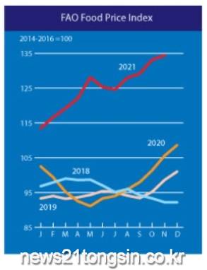 3일 농림축산식품부에 따르면 유엔식량농업기구(FAO)가 발표한 지난달 세계식량가격지수는 1.2% 상승한 134.4포인트에 달했다. 세계식량가격지수는 넉달 연속 상승세를 지속하며 2011년 6월(135.0포인트) 이래 10여년만에 최고치로 높아졌다.