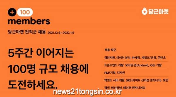 당근마켓(공동대표 김용현·김재현)은 서비스 성장에 따라 우수 인재 영입에 본격적으로 나서며 100명 이상의 전직군 대규모 채용 캠페인 '+100 members'를 5주간 실시한다고 6일 밝혔다.