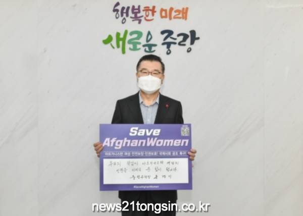 ▲ 사진=중랑구류경기 중랑구청장이 12월 10일 세계 인권의 날을 맞아 아프간 여성 인권보장 SNS챌린지에 동참했다. 아프간 여성 인권보장 SNS챌린지는 지난 8월 김상희 국회부의장을 비롯한 여성 국회의원 49명이 아프간 여성 인권 문제에 대한 정부 역할 촉구와 국제사회 여론 형성을 위한 취지로 전개 중인 릴레이 캠페인이다.