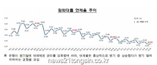 국내 은행의 원화대출 연체율은 2018년 5월 0.62% 기록 이후 하락세를 보이고 있다.