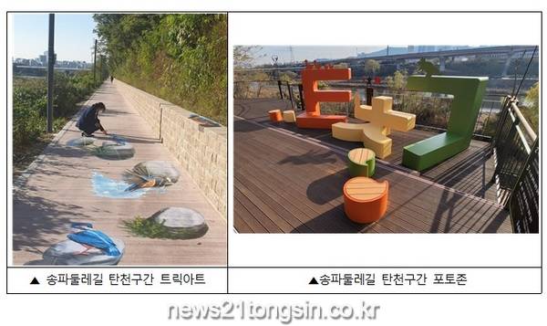 직선 산책로 2개 지점에는 물총새, 흰뺨검둥오리 등 탄천에 서식하는 조류 그림을 트릭아트로 그려 넣어 걷는 재미를 더했다. 또, 탄천 유수지 전망대, 잠실 유수지 전망대에는 탄천길 초성인 ‘ㅌ’, ‘ㅊ’, ‘ㄱ’을 응용한 포토존을 설치해 탄천의 자연과 추억을 담아갈 수 있는 공간을 만들었다.