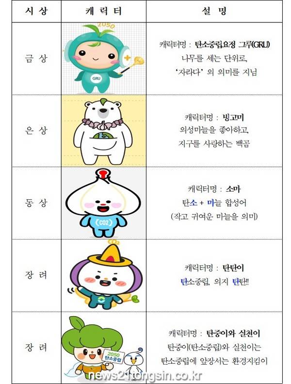 금상에 당선된 탄소중립요정 ‘그루’는 나무를 세는 단위로 ‘자라다’의 의미를 갖고 있으며, 2050 탄소중립을 목표로 성장해 나가기를 바라는 마음이 담겨 있다. 이 외에 은상 빙고미(의성마늘을 좋아하고 지구를 사랑하는 백곰), 동상 소마(탄소와 마늘의 합성어), 장려 탄탄이(탄소중립 의지 탄탄), 탄중이와 실천이(탄소중립의 환경지킴이)로 선정되어 금상 100만원, 은상 70만원, 동상 50만원, 장려 30만원의 상금이 지급된다.