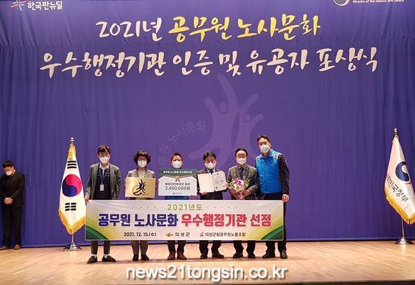 의성군과 의성군청공무원노동조합(위원장 김민성)은 15일 세종시 정부세종청사에서 행정안전부가 주관하는 2021년 공무원 노사문화 우수행정기관 장관 표창을 수상했다.