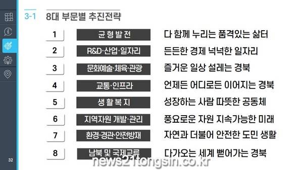 주요 내용으로는‘더 큰 희망, 더 큰 경북’을 비전으로 ▷균형발전 ▷스마트산업 ▷글로벌 문화관광 ▷세계로 통하는 교통․물류망 거점을 4대 목표로 잡고 이를 위한 지역별, 부분별 계획을 반영하고 있다.