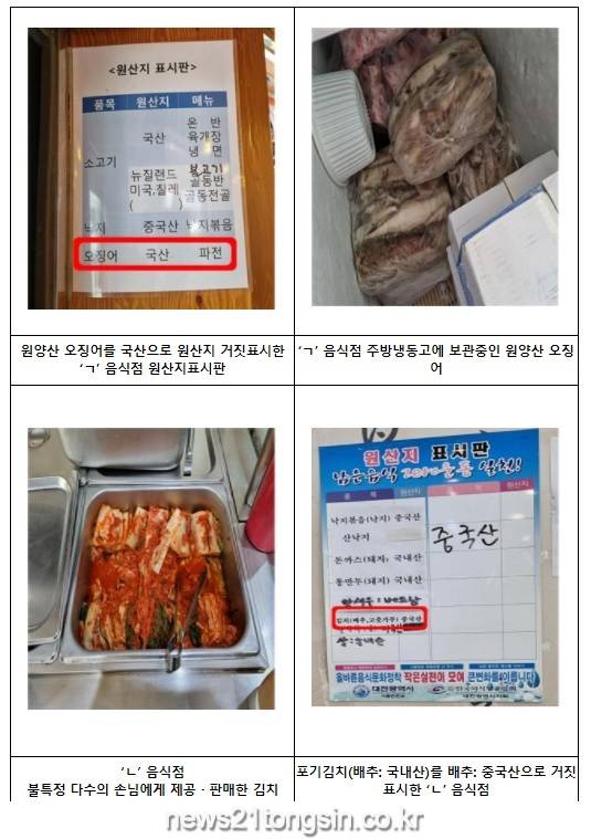 ㅇ 대전시 특별사법경찰에 따르면 ‘ㄱ’ 음식점은 파전의 원료로 사용하는 원양산 오징어를 국내산 오징어로 거짓표시 하였으며, ‘ㄴ’ 음식점은 배추김치의 국내산 배추를 중국산 배추로 원산지를 거짓으로 표시하다 적발됐다.