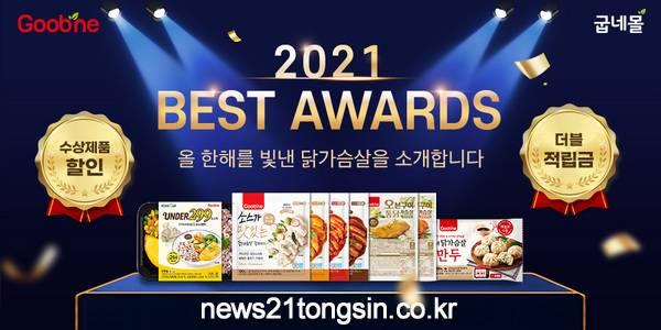 닭가슴살 착한쇼핑 굽네몰(대표 박상면)은 연말을 맞아 오는 31일까지 굽네몰 소비자가 직접 선정한 베스트 제품을 최대 58% 할인하는 ‘2021 베스트 어워즈’ 이벤트를 진행한다고 28일 밝혔다.
