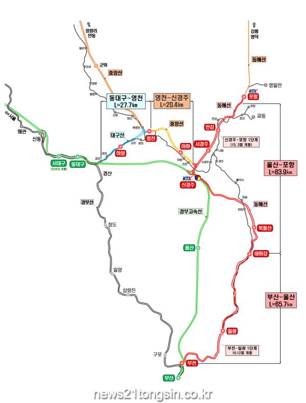 *대구선(동대구~영천), 중앙선(영천~신경주), 동해선(포항~울산, 울산~부산), 동해남부선(울산~포항)