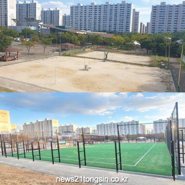 이번 다목적구장 신설로 기존 팬스 미설치로 인한 이곳을 지나치는 시민들이 족구공에 대한 불안감 해소 및 마사토 흙바닥에 따른 우천 시 바닥 물고임 등 불편함을 전용 팬스 설치 및 인조잔디구장으로 전격 리모델링을 시행했다.