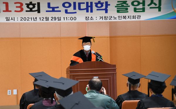 거창군은 29일 (사)대한노인회 거창군지회(지회장 신종학) 주관으로 노인복지회관 3층 강당에서 구인모 군수, 신종학 지회장, 백풍길 노인대학장을 비롯해 참석내빈과 수강생 등 50여 명이 참석한 가운데 제13기 노인대학 졸업식을 개최했다고 전했다.