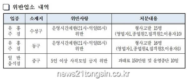 유흥주점, 식당·카페 등 256개소 점검한 결과 3개소를 적발하여 ▲운영시간제한을 위반한 유흥주점 2개소의 위반자(종사자·이용자) 31명은 형사고발 ▲5인 이상 사적모임 금지를 위반한 식당·카페(일반음식점) 1개소는 과태료 150만원 및 운영중단 10일의 행정조치를 취할 예정이다.