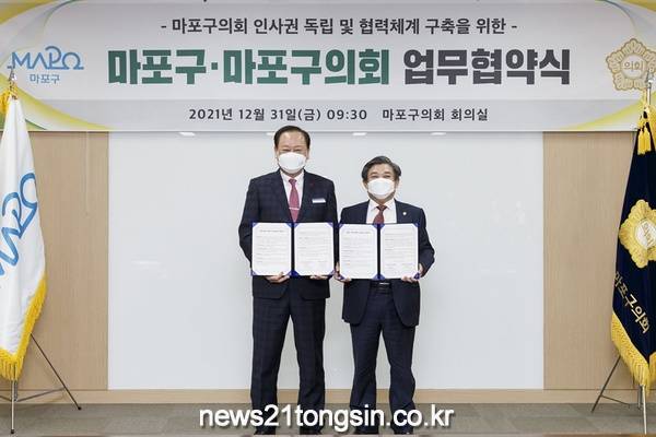 마포구(구청장 유동균)와 마포구의회(구의장 조영덕)가 31일 마포구의회 회의실에서 마포구의회 인사권 독립 및 협력 체계 구축을 위한 업무협약을 체결했다.