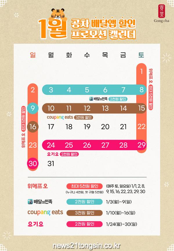 글로벌 티(Tea) 음료 전문 브랜드 공차코리아가 2022년 새해를 맞아 1월 한 달 내내 주요 배달앱에서 할인 프로모션을 진행한다고 3일(월) 밝혔다.