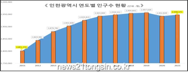 지난 10년간의 인구를 비교해 봐도 인천은 2020년을 제외하고는 매년 큰 폭의 인구증가가 나타나고 있다. 2011년 2,801,2784명에서 10년간 5.25%인 147,101명이 증가한 것으로 나타났다. 같은 기간 서울 740,221명, 부산 200,583명, 대구 121,859명 등 대부분의 특·광역시는 감소한 것과 비교된다.