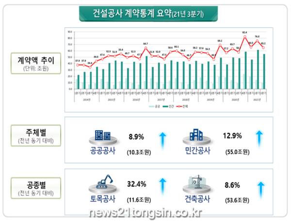 국토교통부(장관 노형욱)는 ’21.3분기(7~9월) 건설공사 계약액은 공공과 민간이 모두 증가하여 전년