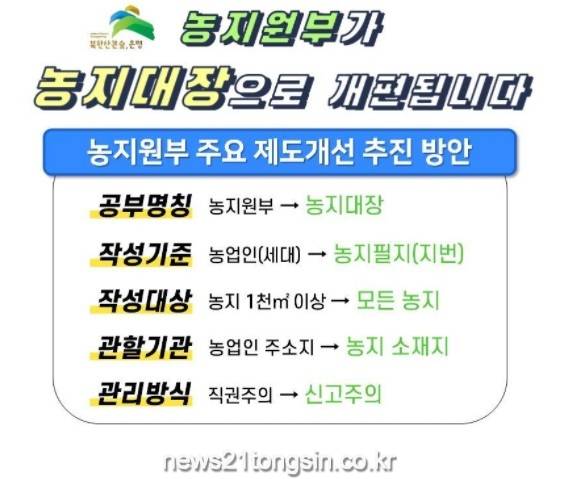 토지대장 등 타 공부와 마찬가지로 필지 기준으로 작성되게 한다. 개인정보 관리보다 개별 농지관리로 공부 성격이 변경된다. 등기부등본 등 타 데이터베이스(DB)*와 연계가 확대돼 대국민 정보 활용와 알 권리 증진에도 도움이 될 것으로 보인다. *등기부등본, 지적공부, 건축물대장, 주민등록등본, 외국인등록정보 등 11종