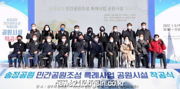 광주시는 6일 송정동 71-22 일원에서 신동헌 시장, 국회의원, 도·시의원, 주민 등이 참석한 가운데 첫 민간공원조성 특례사업으로 추진 중인 송정공원 착공식을 개최했다.