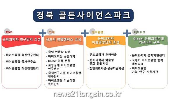 지난해부터 구상해 온 ‘경북 골든사이언스파크’는 1단계로 은퇴 과학기술인력을 연계해 국가 바이오 신산업 허브를 구축하고 2단계로 과학기술과 인문사회학을 융합한 글로벌 혁신 연구단지를 조성하는 대형 프로젝트이다.