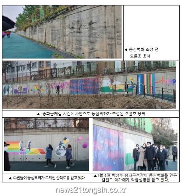 박성수 송구청장은 1월 6일 벽화 인근 주민들과 함께 김진오 작가를 초청해 작품 설명을 듣는 자리를 마련했다. 이 자리에서 박성수 구청장은 “‘송파둘레길 시즌2’ 사업으로 송파구 곳곳이 나날이 달라지고 있다.”면서 “송파둘레길을 걸으며 코로나19로 지친 주민들이 건강도 챙기고 일상을 회복할 힘을 얻도록 ‘시즌2’ 사업에 박차를 가하겠다.”고 말했다.