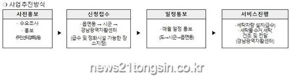 경남광역자활센터가 사업을 총괄해 6개 지역자활센터에서 권역별로 나누어 주 5회 시군 주민센터, 마을회관 등 신청한 장소로 찾아가서 이불 등 대형빨래 서비스를 지원하고 있다.