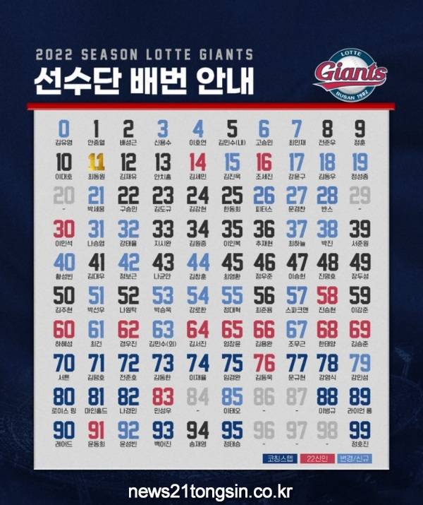 롯데자이언츠(대표이사 이석환)가 2022시즌 선수단 등번호를 확정했다.