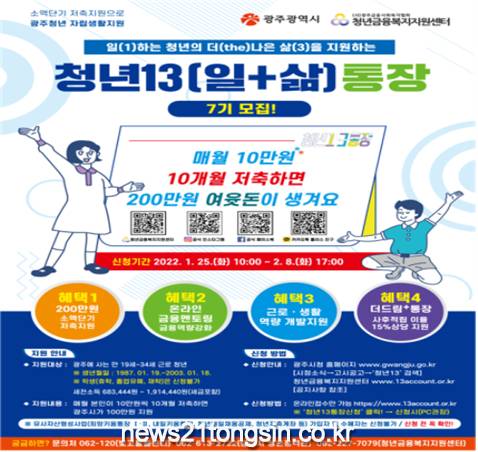 광주광역시는 일하는 청년의 경제적 자립과 생활안정을 지원하는 ‘청년13(일+삶)통장’ 7기 참여자 500명을 모집한다.