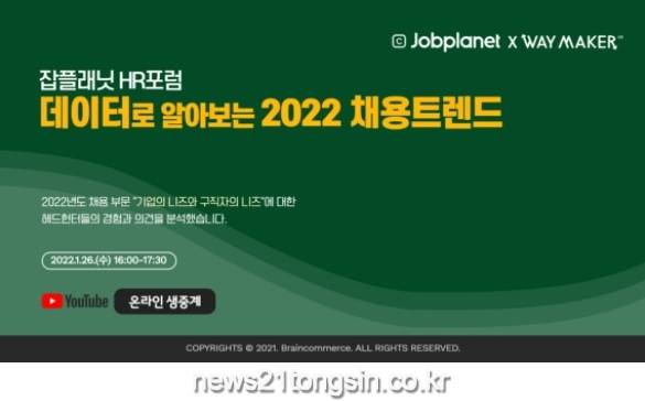 ‘데이터로 알아보는 2022년 채용 트렌드’를 주제로 한 이번 행사에서는 산업/직무별 채용의 규모 변화와 경력직 채용의 증가 등 채용 시장의 다양한 이슈에 대해 다룰 예정이다.