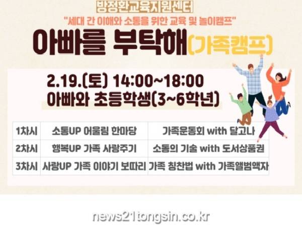 오는 2월 19일에 운영되는 ‘아빠를 부탁해’ 가족 캠프는 세대 간 이해와 활발한 소통을 통해 가족 간의 유대감을 증진시킬 수 있도록 기획된 프로그램이다. 지역 내 거주 중인 초등학교 3,4,5,6학년 학생과 남성 학부모라면 신청이 가능하다.