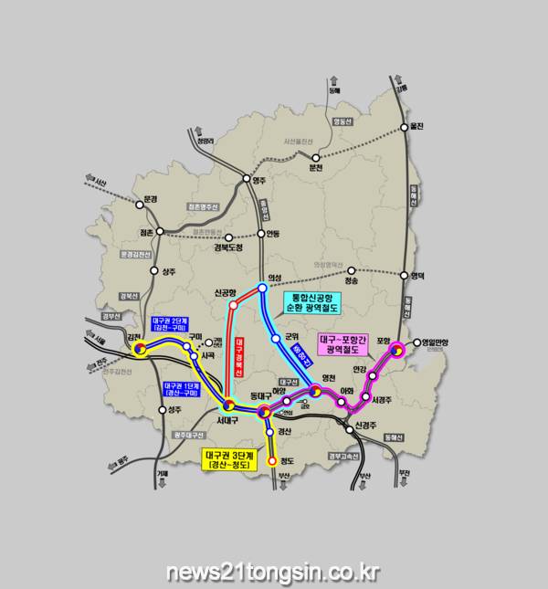 구미-칠곡-대구-경산을 잇는 총연장 61.8km 대구권 광역철도 1단계 사업은 2023년 하반기 개통예정으로 우선 구미에서 경산을 40분대에 연결해 하나의 생활경제권이 마련된다.