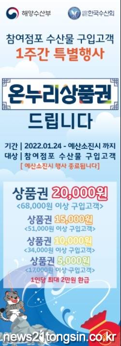 이 기간 동안 참여점포에서 국내산 수산물을 17,000원 이상 ~ 34,000원 미만 구매할 경우 온누리상품권 5천 원권을 지급하며, 34,000원 이상 ~ 51,000원 미만은 온누리상품권 1만원, 51,000원 이상 ~ 68,000원 미만은 1만 5천원, 68,000원 이상은 2만 원을 온누리상품권 환급받을 수 있다.
