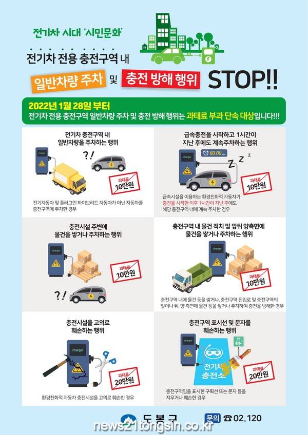 ▲ 사진=도봉구청도봉구(구청장 이동진)는 1월 28일부터 모든 전기자동차 충전구역 내 충전방해행위에 대해 단속을 직접 실시한다.