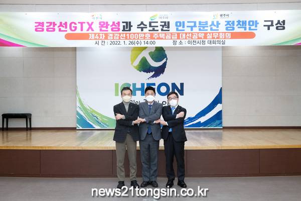 이천시(시장 엄태준)가 광주시와 여주시와 함께 추진 중인, 경강선100만호 주택공급 대선공약 추진 제4차 실무회의에 3개시 자치단체장이 참석하여 실무자들을 격려했다.