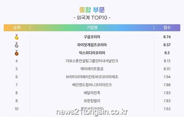 구글코리아는 8.74점으로 외국계 1위, 종합 4위에 올랐다. 구글은 지난해에 이어 올해도 잡플래닛이 뽑은 주목할 기업 외국계 부분 1위에 오르며, 명실상부 글로벌 대표 기업의 저력을 보였다. 조직원들의 구글에 대한 신뢰와 믿음은 리뷰에서 고스란히 드러난다. "찐 수평적인 문화" "엄청난 업무자율성" "높은 기본금과 보너스 주식" "서로 배려하는 조직문화" "일에 집중할 수 있는 환경을 만들어 줌" "최고의 복지를 자랑하는 진짜배기 외국계 기업" 등 급여와 복지, 사내문화, 일하는 방식까지 모든 부문에서 흠잡을 데 없는 만족감을 보였다.