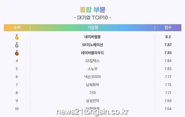 기업별 평가는 총만족도 점수에 △복지·급여 △승진 기회·가능성 △워라밸(업무와 삶의 균형) △사내문화 △경영진 평가 등 5개 항목을 더해 10점 만점으로 표시했다. 일하기 좋은 회사는 어떤 회사일까? 누군가에게는 연봉과 복지가, 누군가에게는 워라밸(일과 삶의 균형)이, 또 누군가에게는 회사의 성장 가능성과 비전이 회사를 선택하는 기준이 될 수도 있겠다.