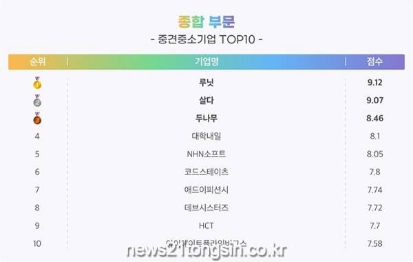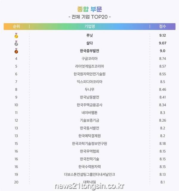 평가 결과 전체 종합 부문 1위는 루닛(9.12점)이었고, 2위 살다(9.07점), 3위가 한국중부발전(9점)이었다. 분야별로는 중견·중소 기업 1위가 루닛(9.12점), 외국계 1위가 구글코리아(8.74점), 대기업 1위가 네이버웹툰(8.3점)이 선정됐다.
