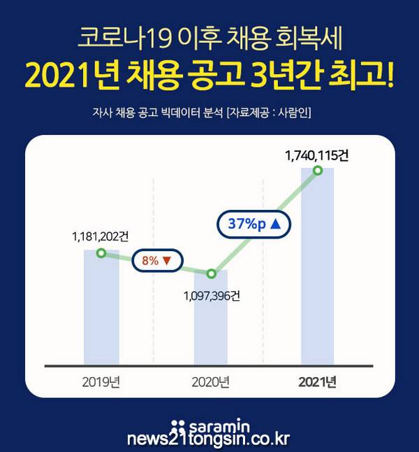 커리어테크 플랫폼 사람인(www.saramin.co.kr 대표 김용환)이 자사에 등록된 3개년(2019년~2021년) 채용 공고 빅데이터를 산업별, 직업별로 분석했다.
