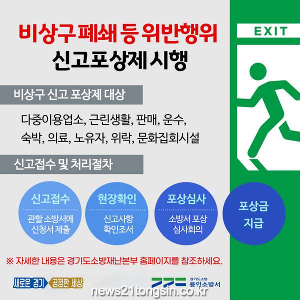 용인소방서(서장 임국빈)는 오늘(4일) 피난통로 확보와 자율적인 안전관리를 위한‘비상구 폐쇄 등 불법행위 신고포상제’를 연중 운영한다고 밝혔다.