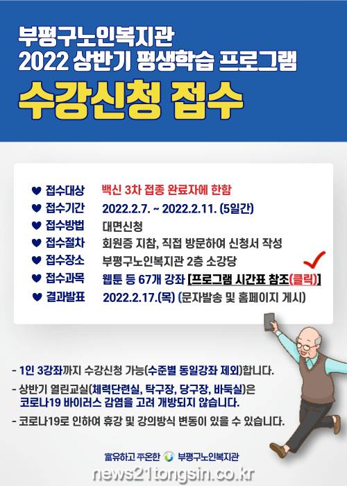 부평구 노인복지관(관장: 최민수)은 어르신 학습권 보장을 위해 2022년 상반기 평생학습 프로그램 운영 계획을 확정하고, 복지관 회원 중 백신 추가 접종자를 대상으로 오는 7일부터 11일까지 수강생을 모집한다.
