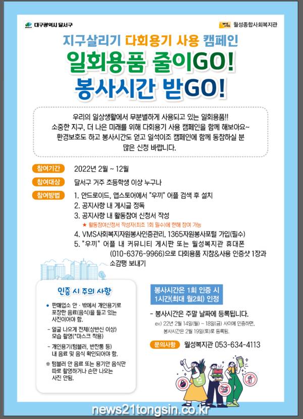 (대구=뉴스21통신) 박창남기자 = 달서구는 2월부터 12월까지 달서구 거주 초등학생이상 구민을 대상으로 일회용품 사용을 줄이고 환경보전을 실천하는‘일회용품 줄이GO! 봉사시간 받GO!’캠페인을 펼친다고 밝혔다.