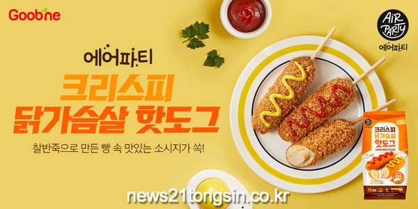 굽네 기술로 만든 맛있고 건강한 닭가슴살 쇼핑몰 굽네몰(대표 박상면)이 에어프라이어 전용 브랜드 ‘에어파티’의 신제품 ‘크리스피 닭가슴살 핫도그’를 출시했다고 7일 밝혔다.