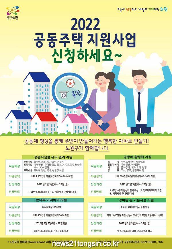 구는 큰나무 가지치기, 노후배관 교체사업까지 포함해 올해 총 22억의 예산을 공동주택 지원에 투입할 예정이다. 각 사업과 관련한 문의사항은 노원구청 공동주택지원과(02-2116-3847)로 전화하면 안내받을 수 있다.