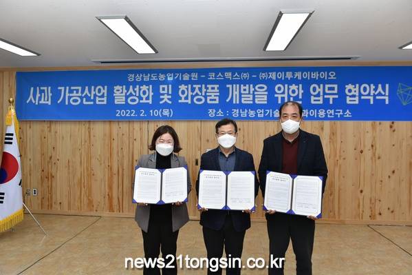 경상남도농업기술원(원장 정재민)이 사과를 활용한 다양한 화장품 개발 및 경남지역 사과산업 활성화를 위해 화장품 기업인 코스맥스(주)(대표 이병만), ㈜제이투케이바이오(대표 이재섭)와 3자 간 상호 업무협약을 체결하였다.