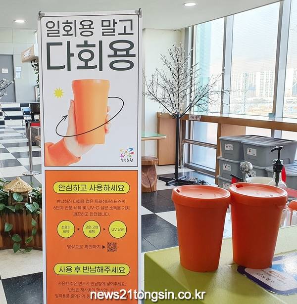 ‘다회용컵 공유시스템’ 도입에 따라 2월부터 청사 카페 내 모든 음료는 개인컵 또는 다회용컵으로만 받을 수 있다.