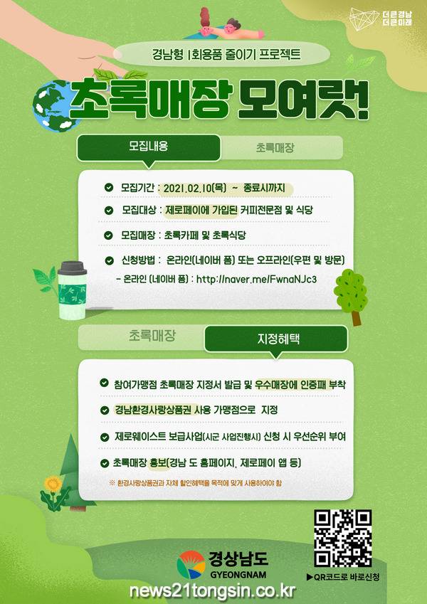 경남도(도지사 권한대행 하병필)는 음식이나 음료를 포장 주문할 때 다회용기를 사용하는 고객에게 할인 혜택을 주고, 쓰레기를 줄이는 생활문화 정착에 동참하는 경남형 초록매장(이하 “초록매장”)을 2월 10일부터 종료시까지 모집한다고 밝혔다.