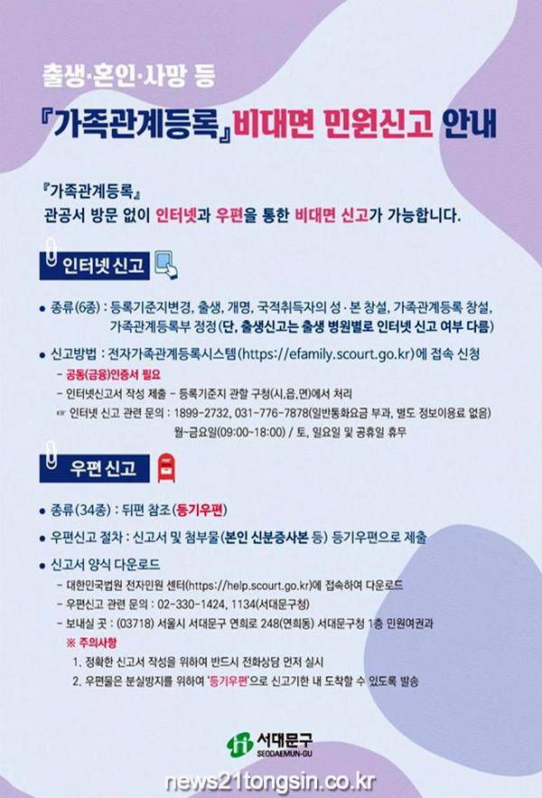 서대문구가 생활 속 거리두기 실천의 일환으로 ‘비대면 가족관계등록신고’ 활성화 계획을 연중 추진한다.