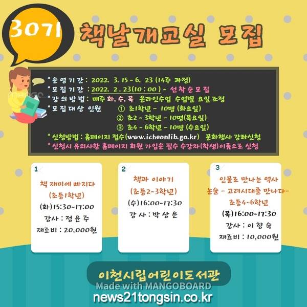 이번 30기 책날개 교실은 2월 23일 수요일 오전 10시부터 이천시통합도서관 홈페이지(www.icheonlib.go.kr)에서 신청이 가능하며, 선착순으로 모집된다.